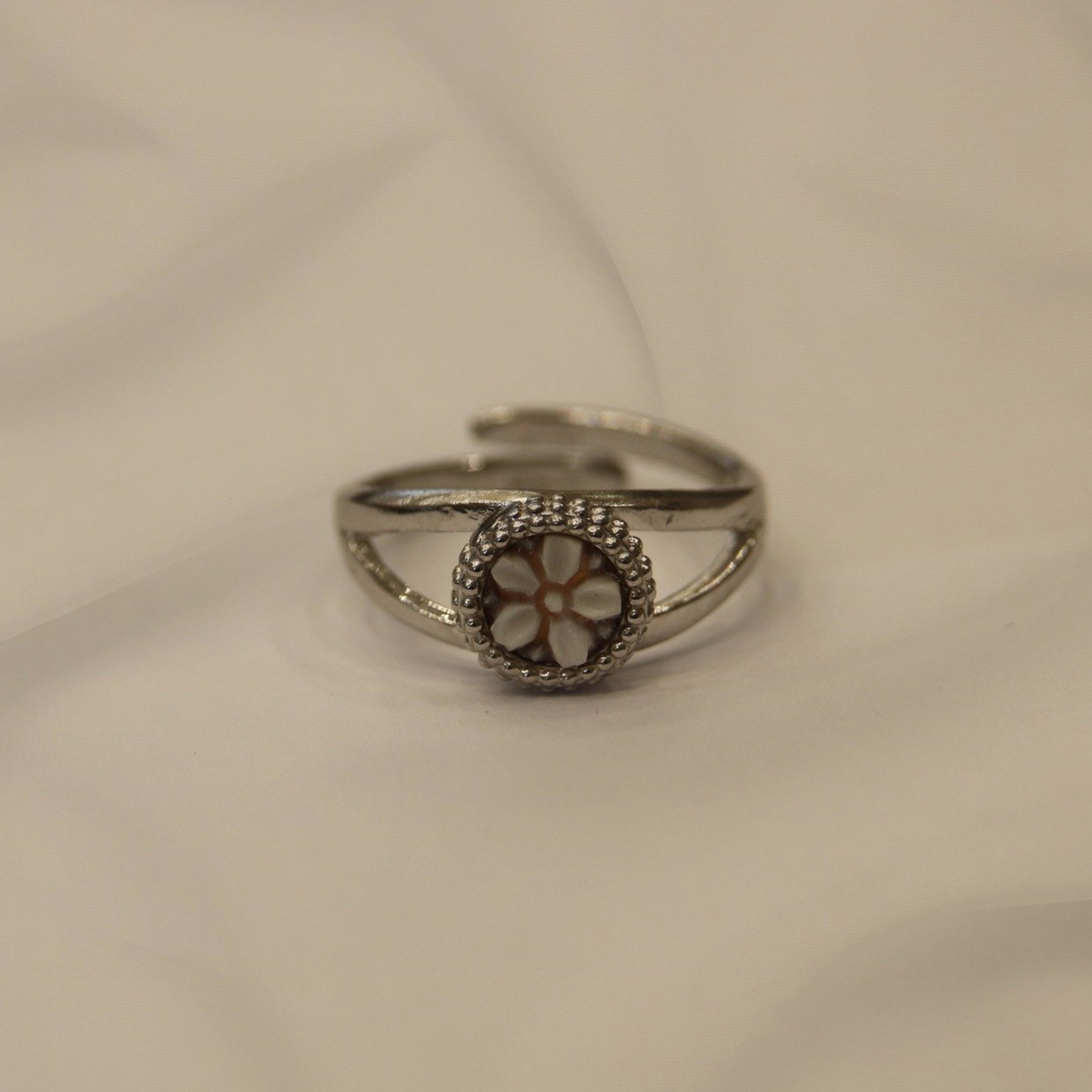 Anello Cammeo a Fiore – Argento Bianco Rhodié, Conchiglia Sardonica, Taglia Regolabile