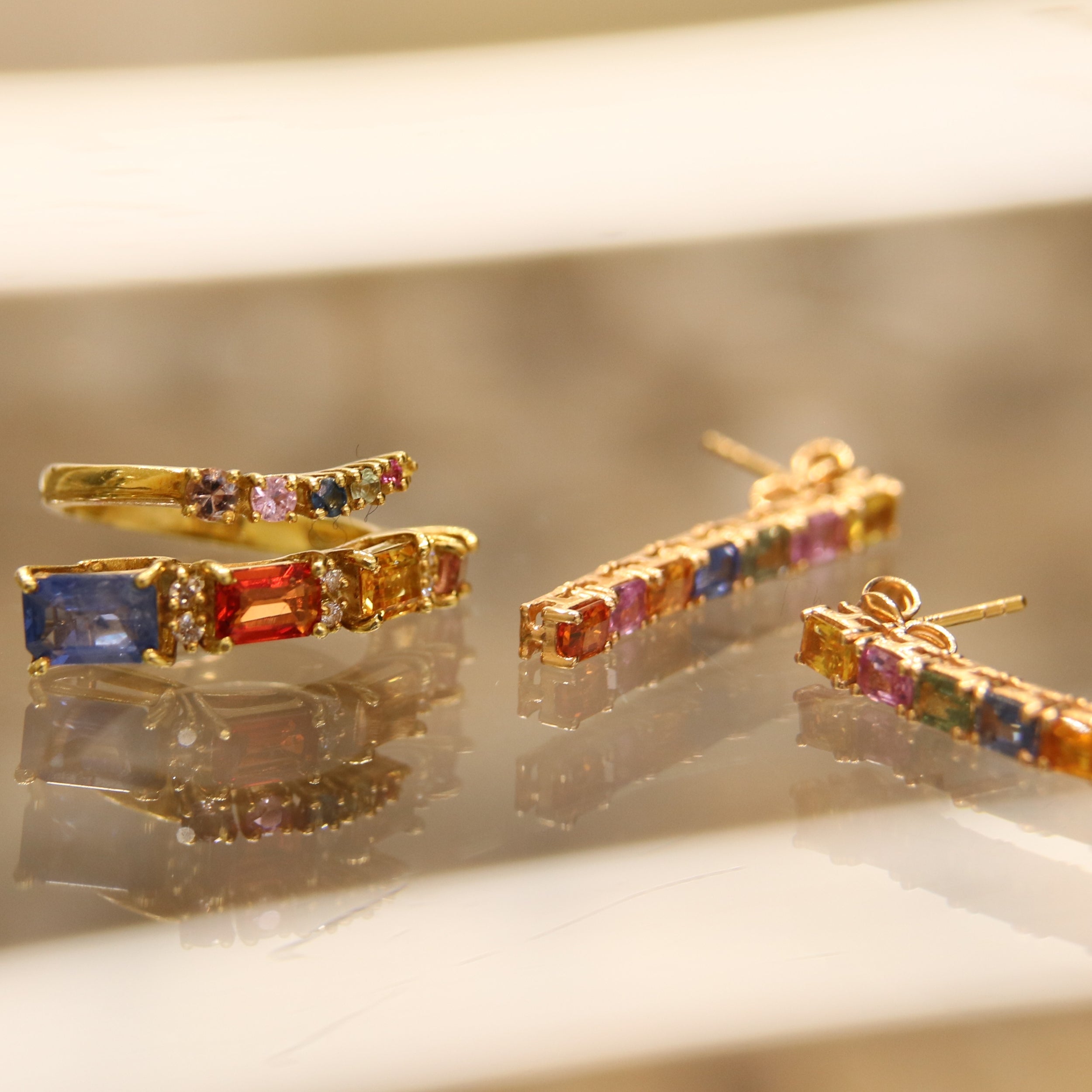 Gli zaffiri multicolore si rincorrono in una danza cromatica che rende ogni pezzo unico. I diamanti naturali, puri e luminosi, donano quel tocco finale di luce che rende questi gioielli perfetti per ogni occasione, da una serata importante a un momento speciale da ricordare per sempre.