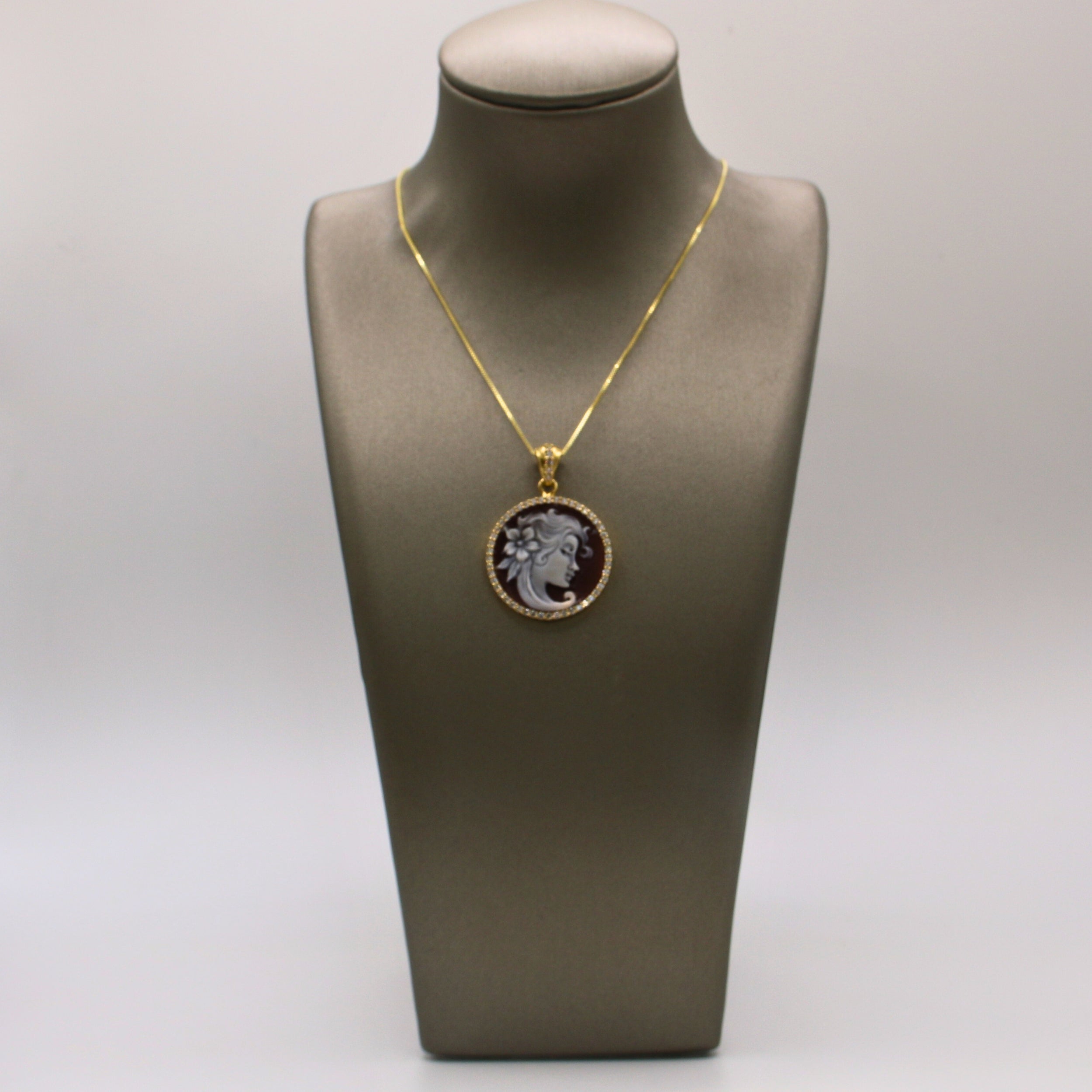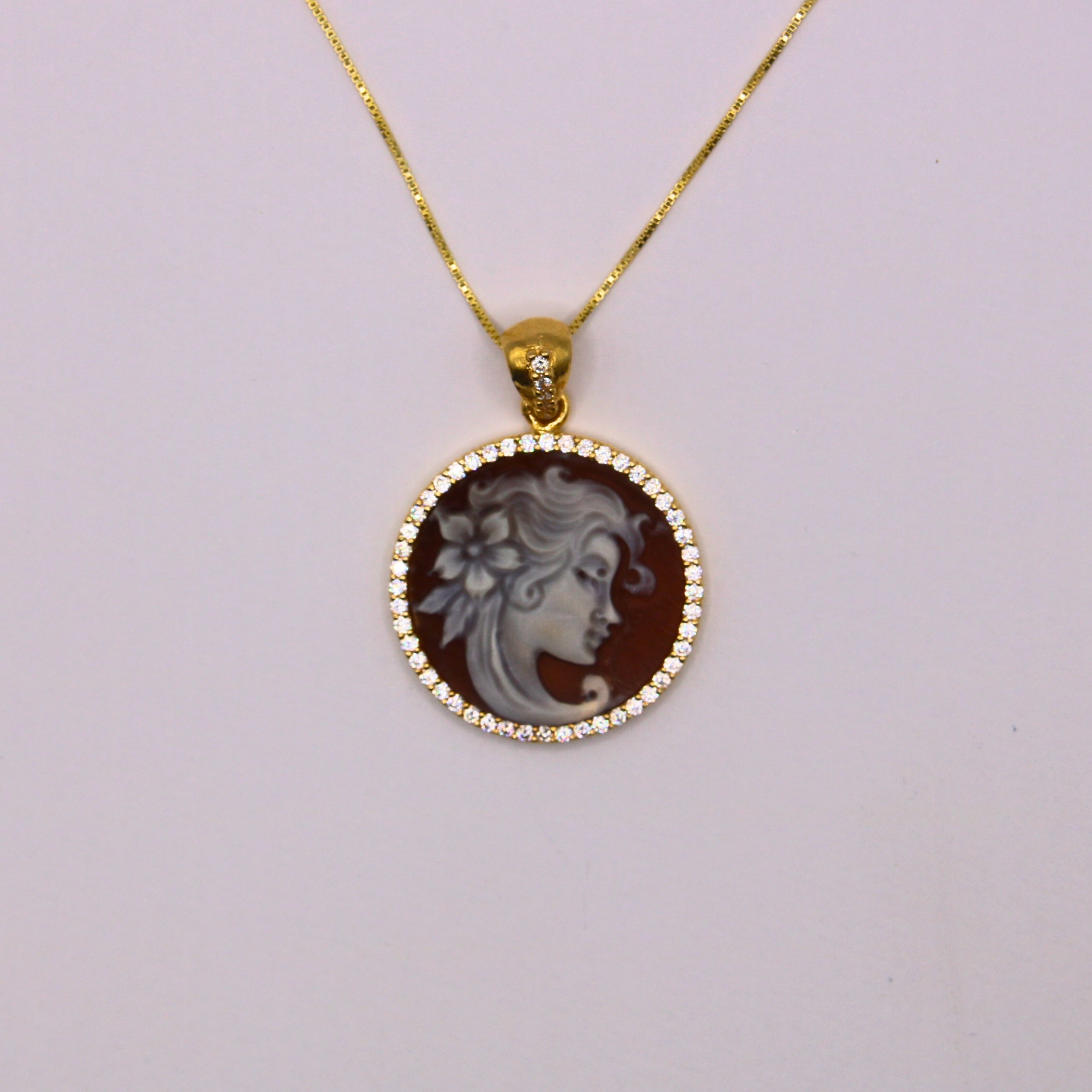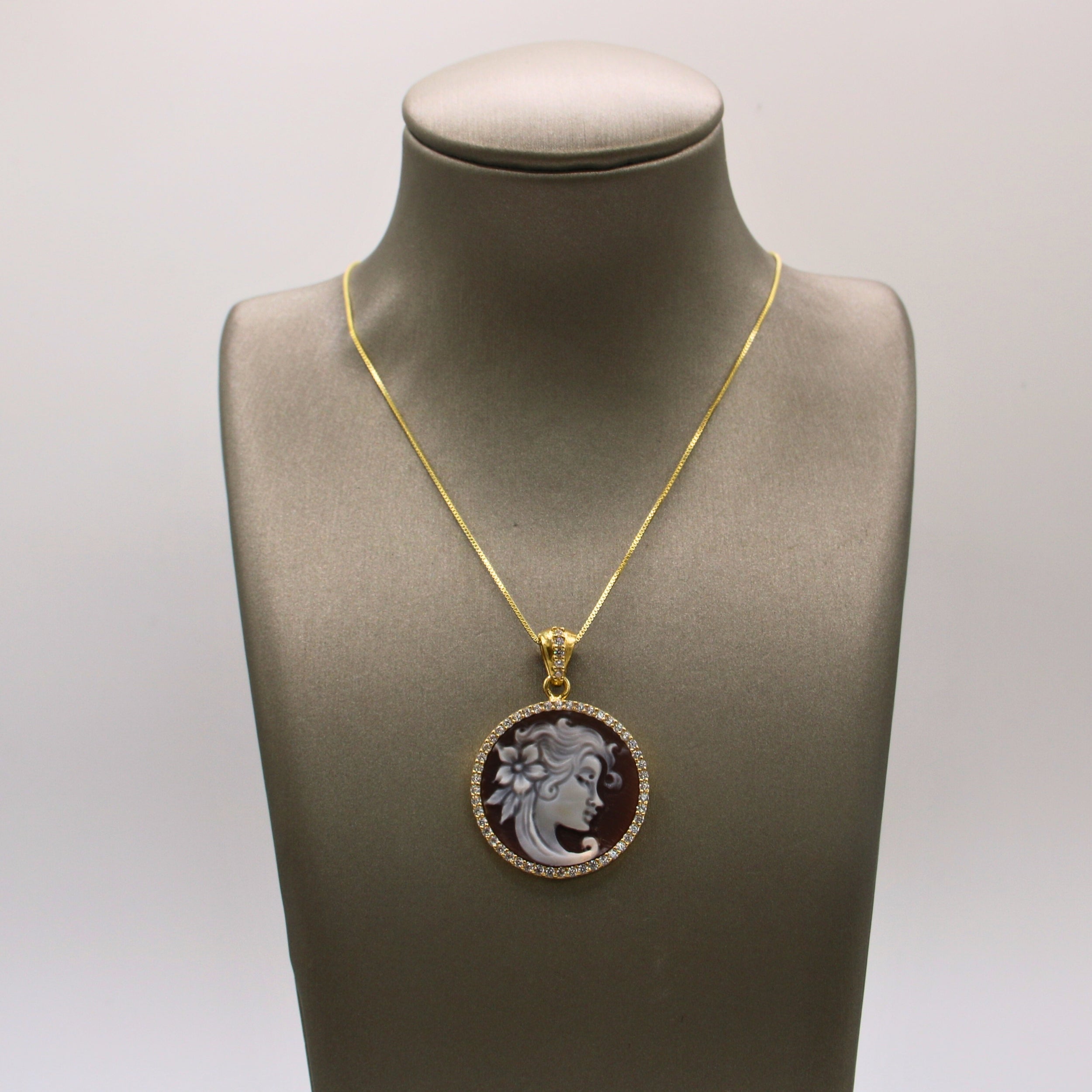 The round profile cameo pendant is a timeless and elegant piece, entirely hand-carved from sardonyx shell, one of the most prized materials for traditional cameo engraving. The classic female profile is enhanced by a gold-plated sterling silver setting adorned with sparkling zirconia, blending heritage craftsmanship with modern brilliance.