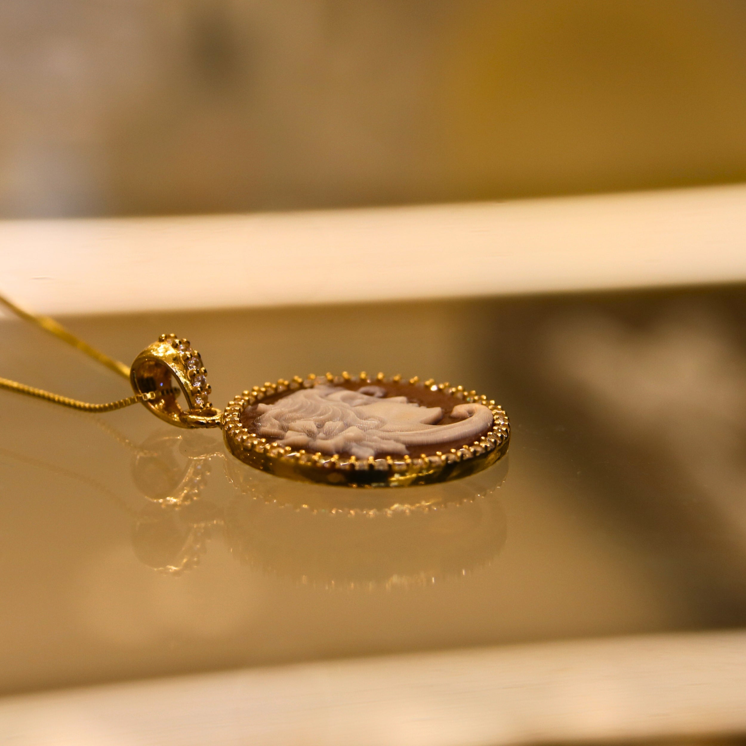 Each cameo is individually carved by hand, making every pendant a unique miniature artwork. The 22 mm round shape offers perfect balance and harmony, ideal for daily wear or special occasions.