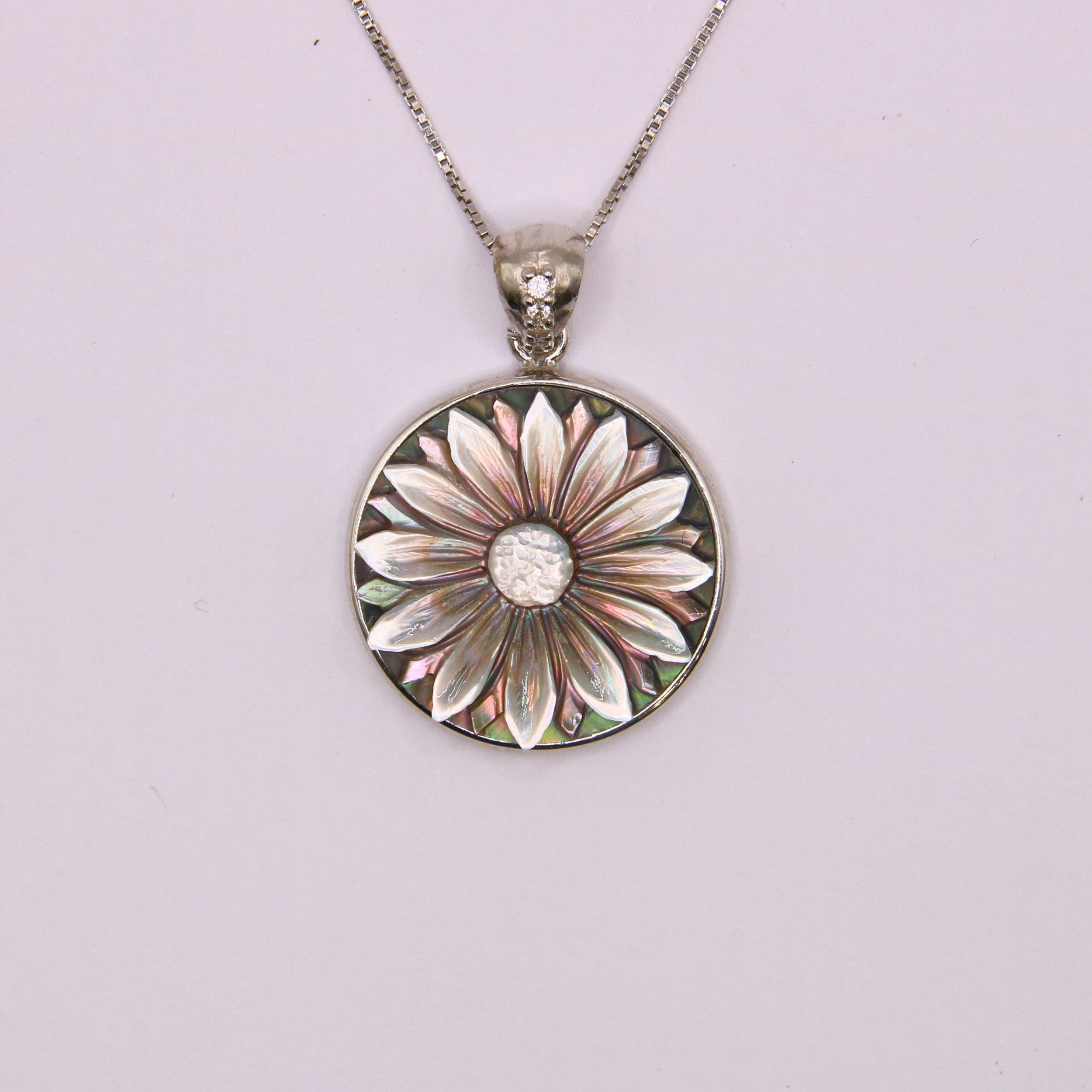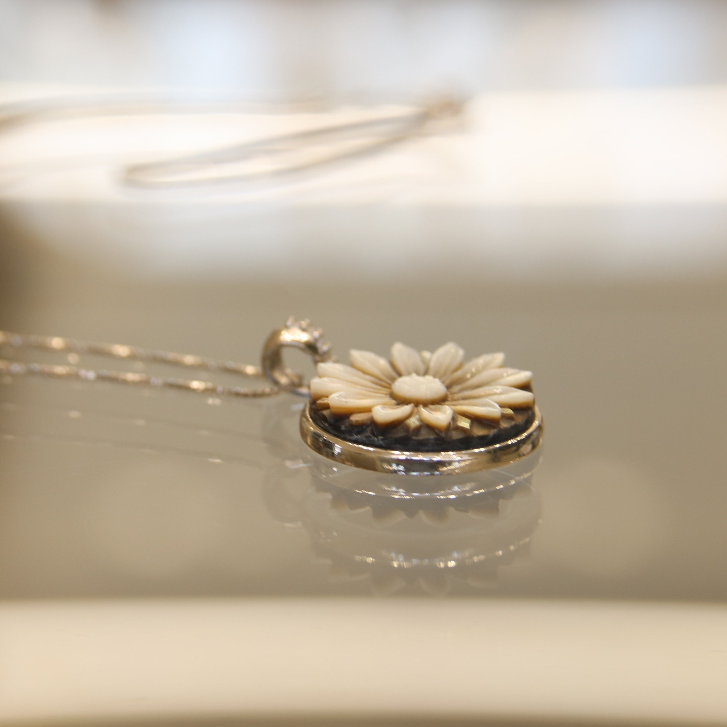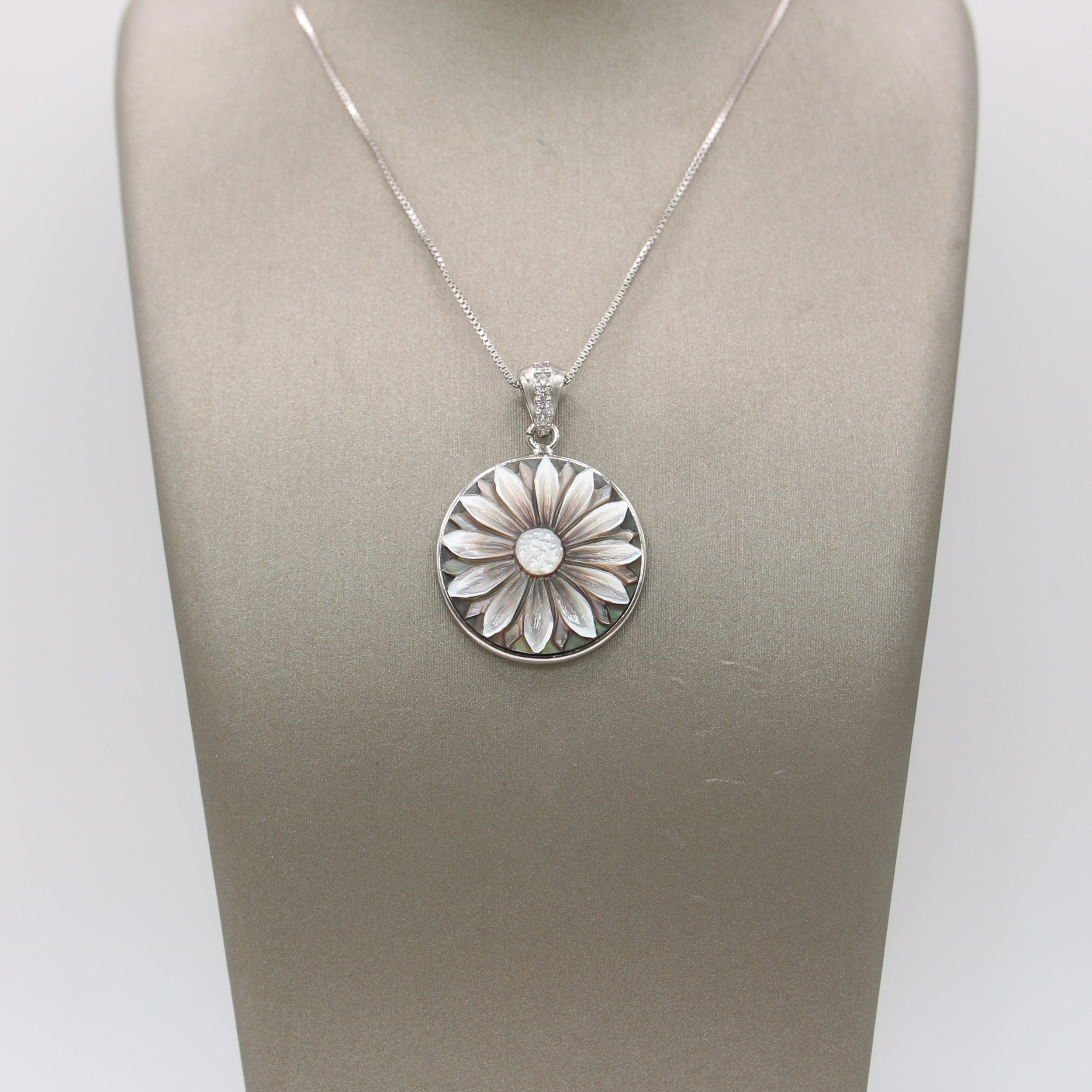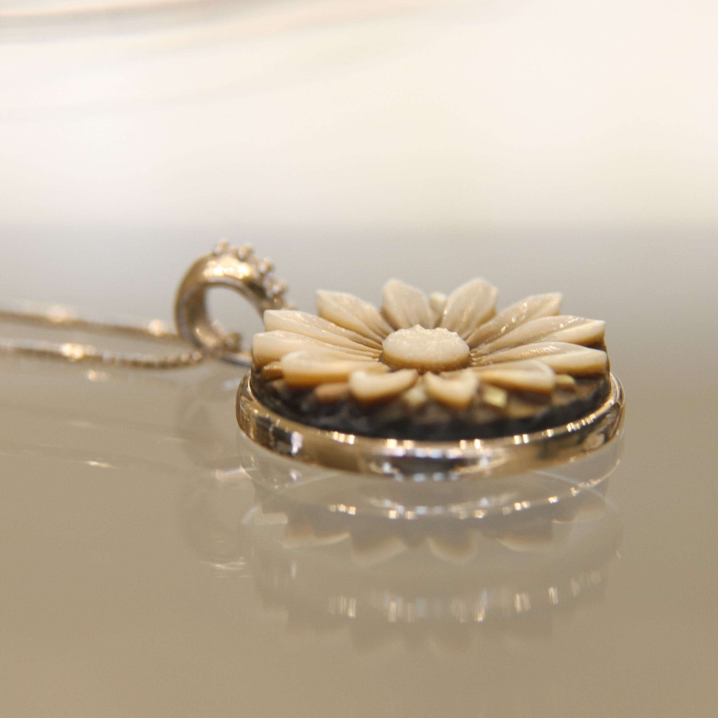 Handcrafted Mother-of-Pearl Cameo Pendant Ø22 mm – Flower Design in Rhodium-Plated Sterling Silver 925