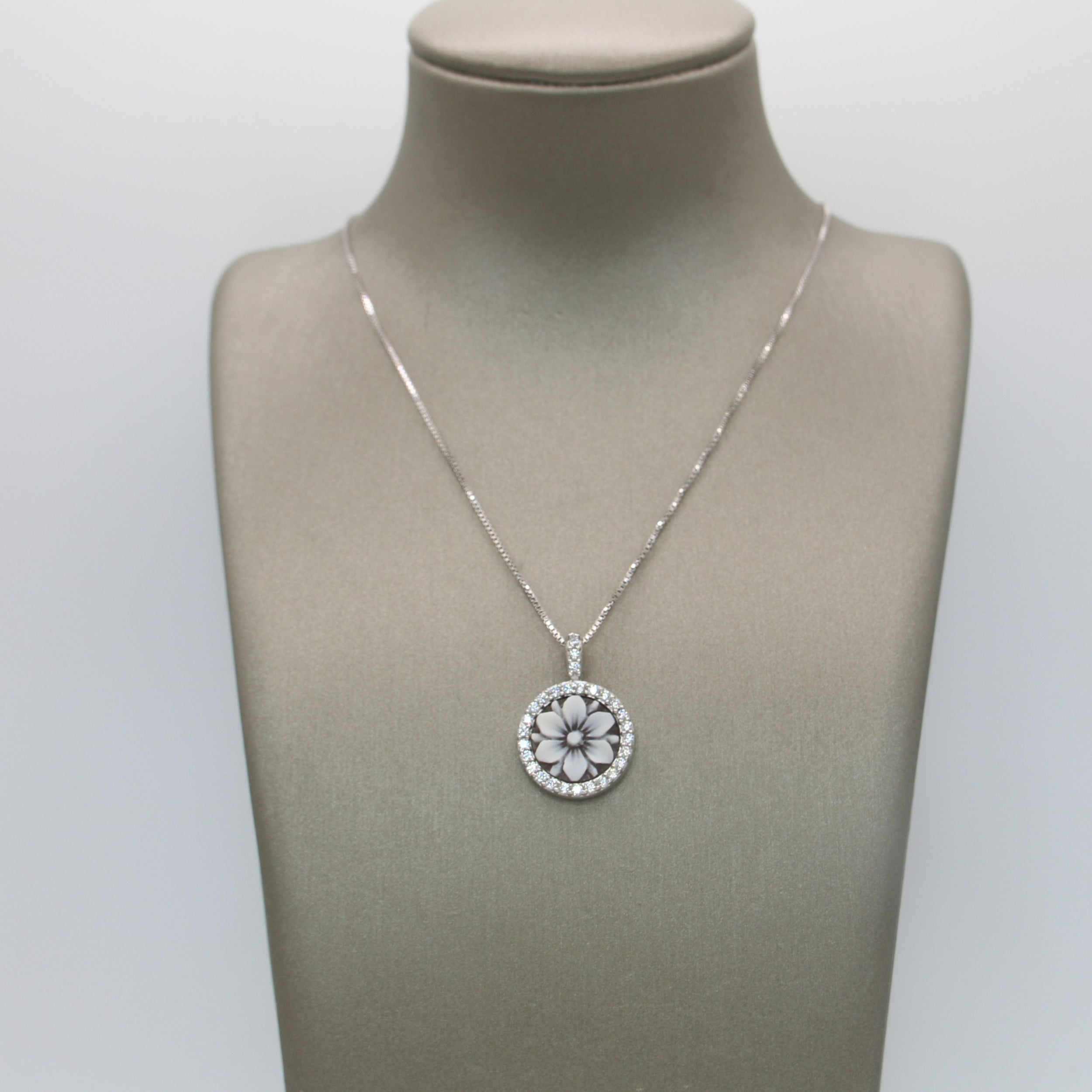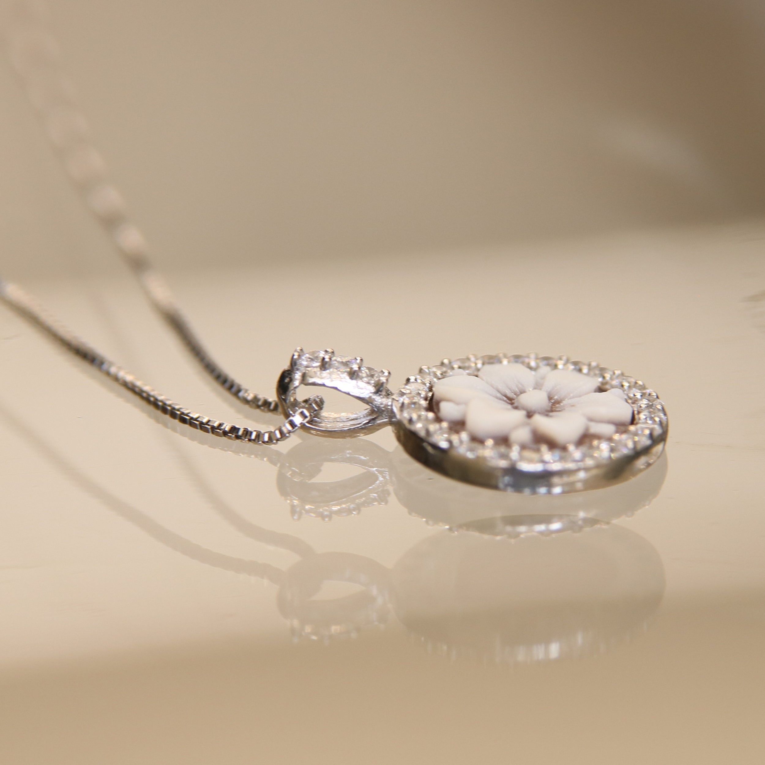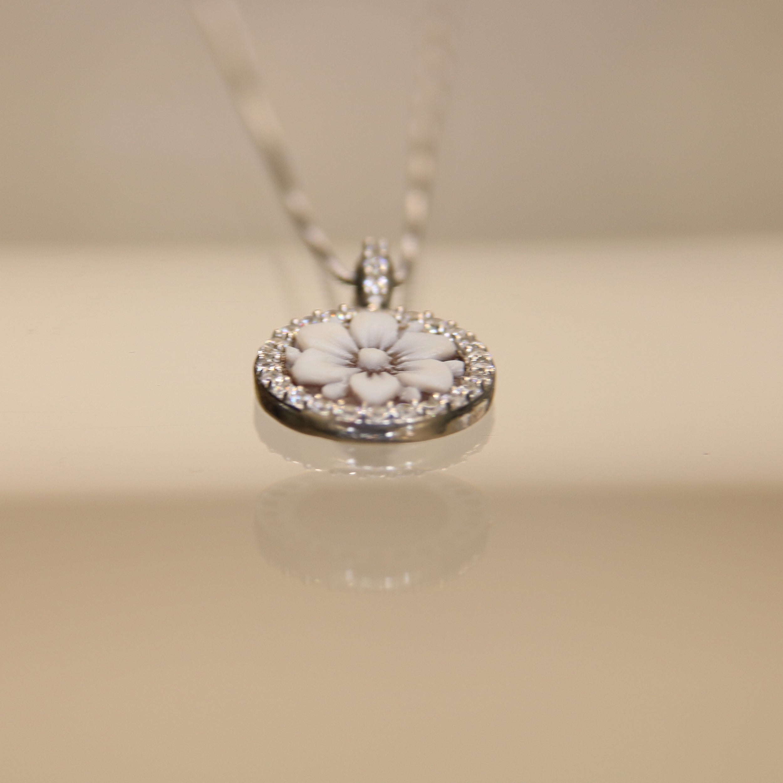 The cameo features a delicate floral motif enhanced with sparkling zircons, adding brilliance and charm to this artisanal pendant.
