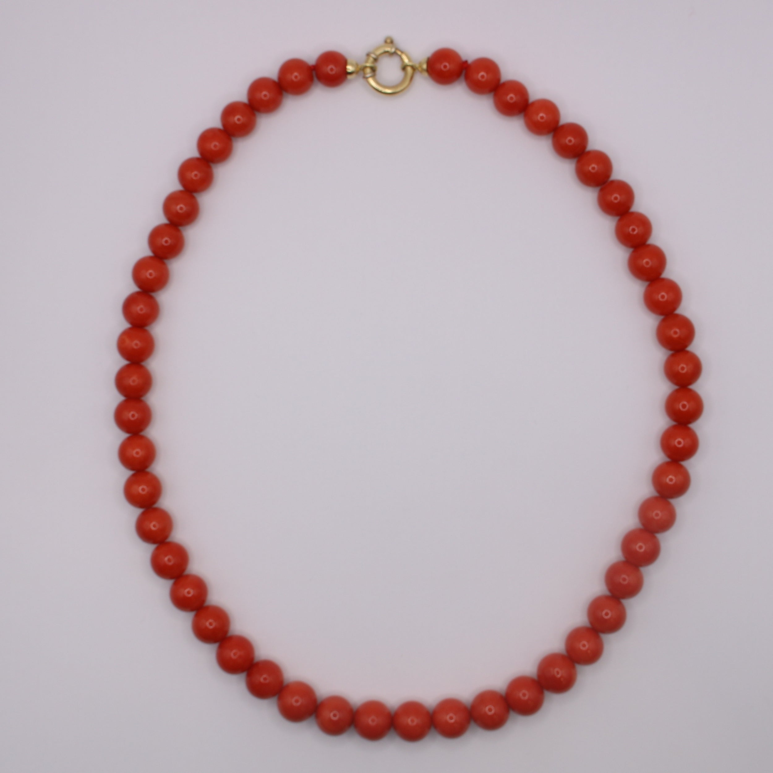 Mediterranean Red Coral Bead Necklace 10mm – 18kt Yellow Gold Clasp – Certified