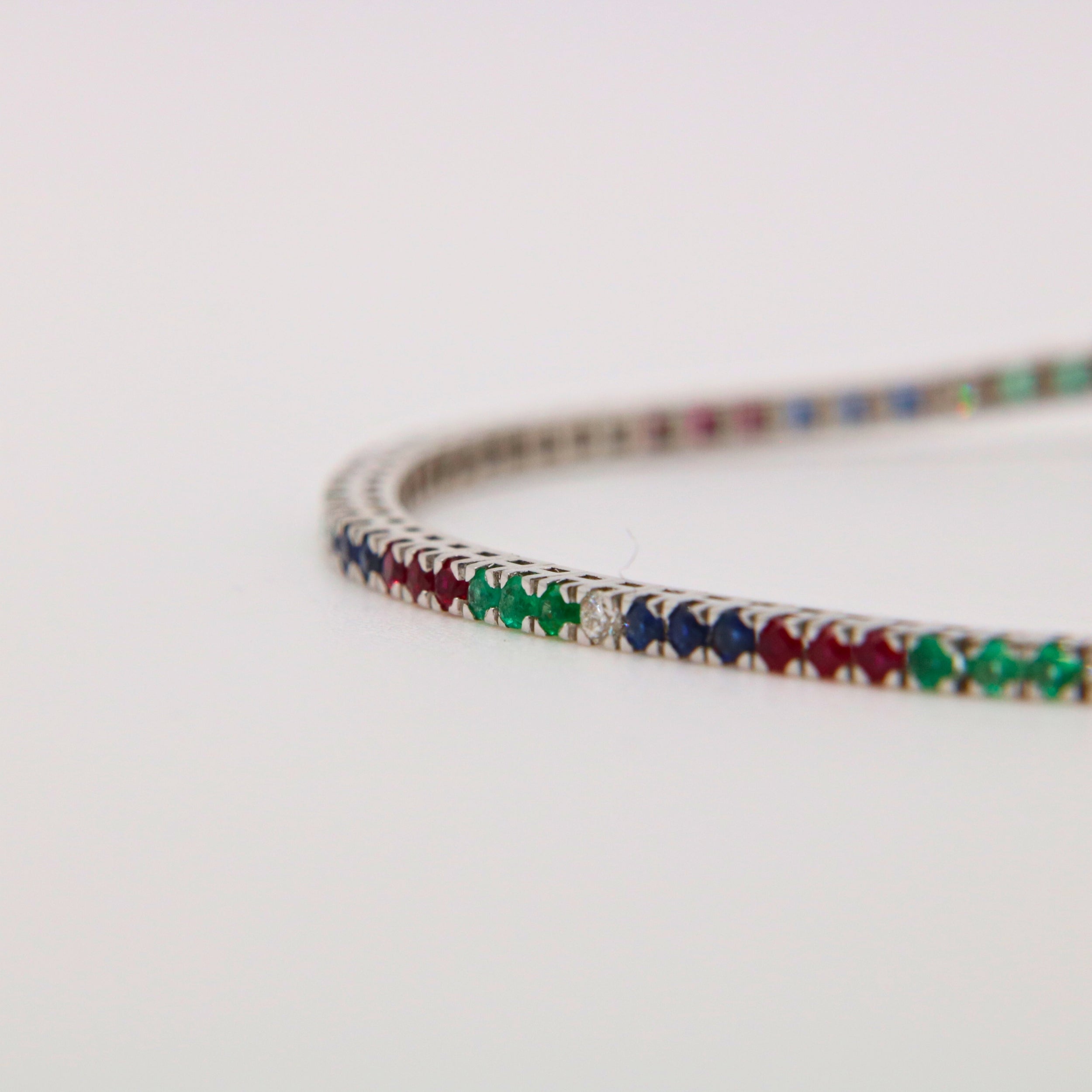 Il nostro bracciale tennis multicolor è un’esplosione armoniosa di colori e brillantezza, perfettamente bilanciata tra eleganza classica e creatività contemporanea. Realizzato in oro bianco 18kt, è composto da: